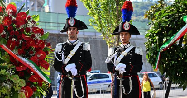 (ANSA) - GENOVA, 14 AGO - Rose bianche e rosse nelle tre corone di fiori della Presidenza della Repubblica, del Senato e del Consiglio dei ministri oltre a quella d'alloro dei familiari delle vittime sono state collocate, dal viceministro Edoardo Rixi con Egle Possetti, presidente del Comitato ricordo vittime Ponte Morandi, vicino alla targa che reca il nome delle 43 vittime di Ponte Morandi nella radura dove è iniziata la cerimonia di commemorazione del sesto anniversario del crollo di Ponte Morandi che, a Genova, portò alla morte 43 persone, il ferimento di altre 16 e 566 sfollati. Presenti oltre a Possetti e Rixi il sindaco di Genova Marco Bucci il governatore ad interim Alessandro Piana. le autorità civili e militari. Stamani alla messa celebrata nella chiesa di Certosa, l'arcivescovo Marco Tasca ha ricordato l'importanza di "far sentire la nostra presenza e il 'prendersi cura' dell'altro". (ANSA).