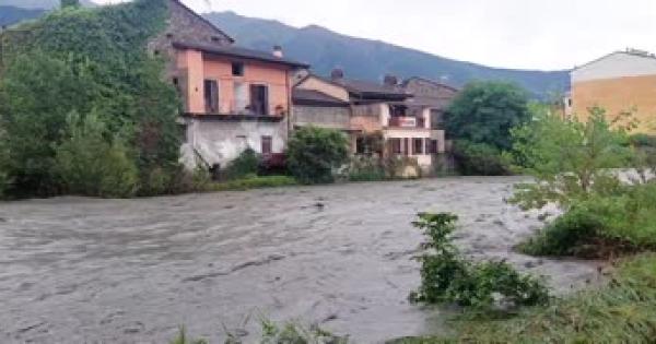 Il fiume in piena attraversa il centro del paese di Bussoleno, provincia di Torino