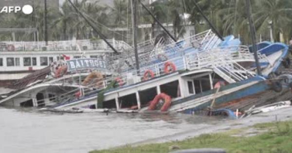 Nell'area di Halong Bay, imbarcazioni accatastate, edifici e alberi abbattuti