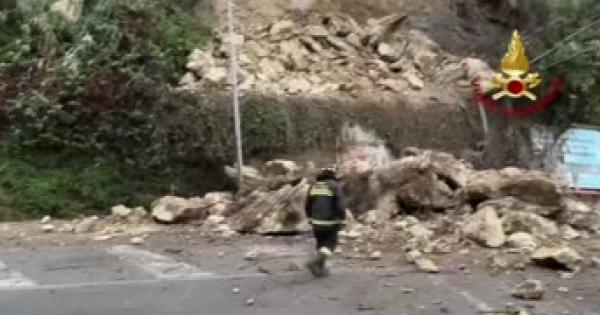 Intervento dei Vgf per rimuovere un costone roccioso crollato in strada a Enna