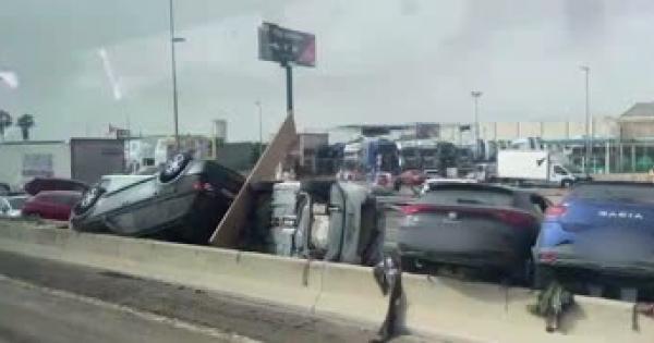 Un lungo tratto di un'arteria a scorrimento veloce ostruita da auto e camion