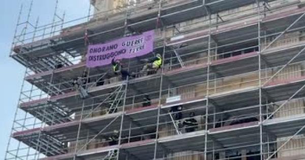 Striscione sulle impalcature di Palazzo Madama: "Onorano guerre, distruggono terre"