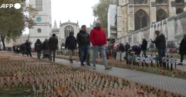 Migliaia di croci con poppies e dediche piantate presso l'Abbazia di Westminster