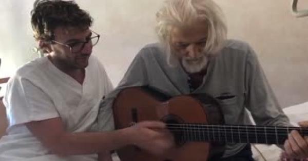 Con l'aiuto del fisioterapista, Vincenzo Maccagnani canta e suona la chitarra