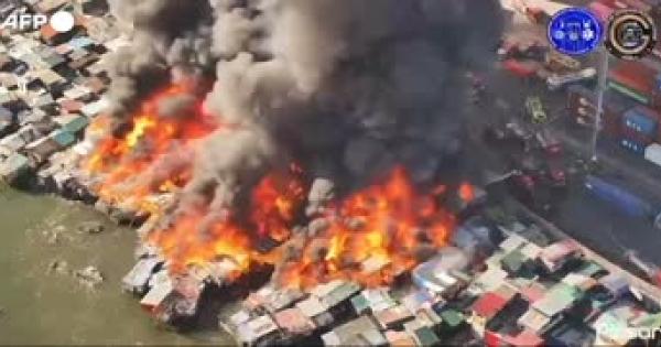 Le fiamme avvolgono le case a Isla Puting Bato nel distretto di Tondo