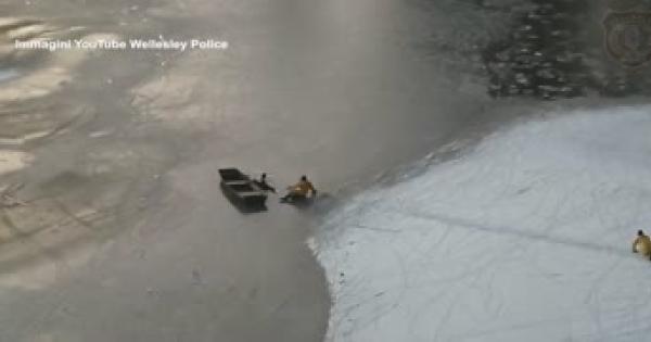 Avanzano nelle gelide acque grazie ad una fune metallica