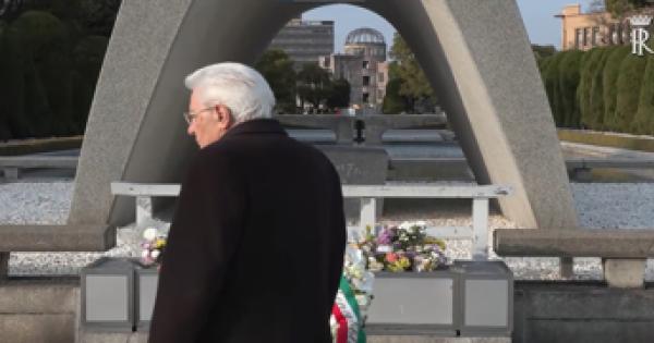 Depone una corona di fiori nel luogo che ricorda l'esplosione della bomba atomica