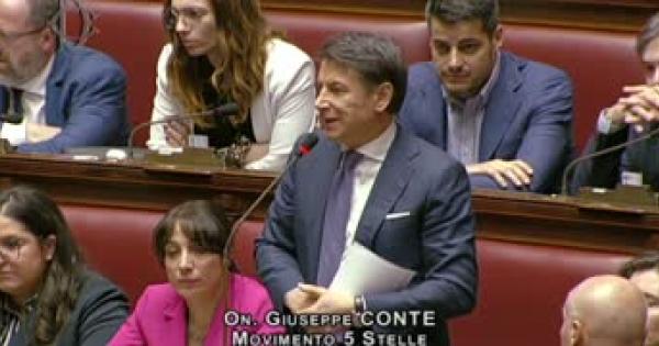 Il leader del M5s parla alla Camera: "Quando parleremo di Riarm Ue?"