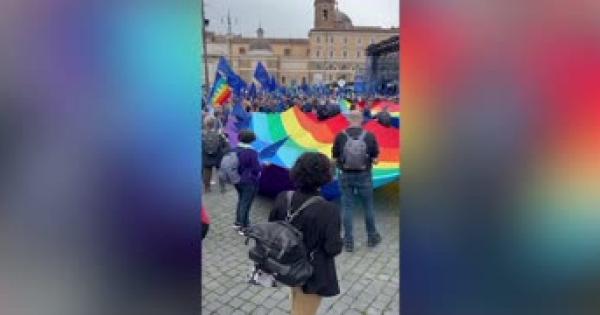 Ideata dal giornalista Michele Serra. Sventolano bandiere arcobaleno, di Ue e Ucraina