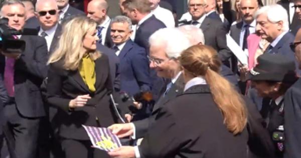 Uno di loro dona al Presidente un disegno con la bandiera del Palermo
