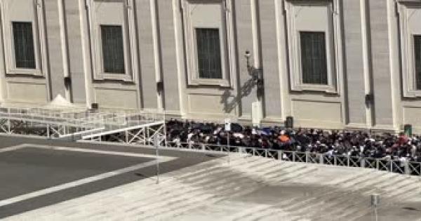 La fila dei fedeli, racchiusi fra le transenne, si estende lungo via della Conciliazione