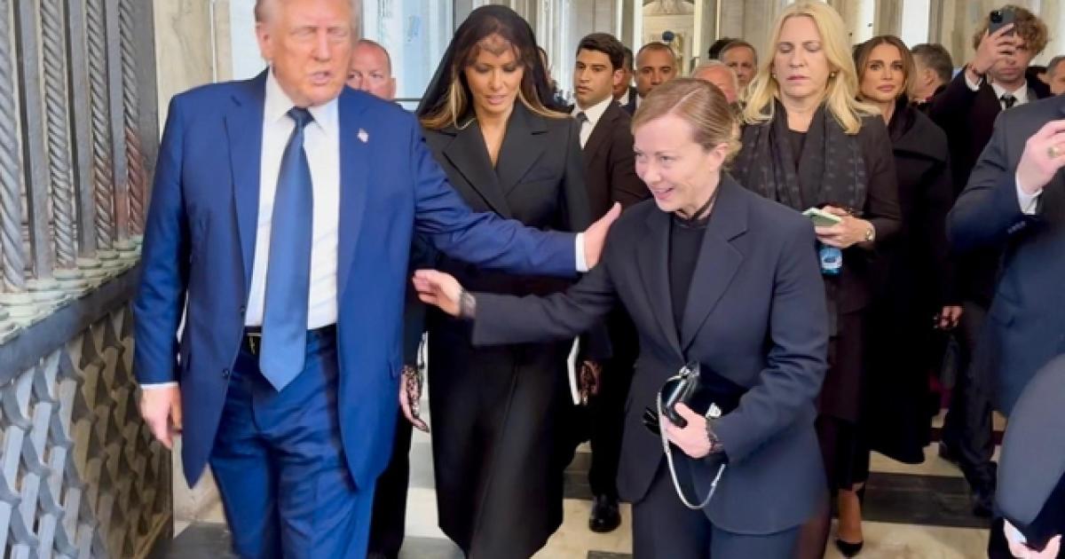 (ANSA) - ROMA, 26 APR - Breve colloquio tra la presidente del Consiglio Giorgia Meloni e il presidente americano Donald Trump al termine del funerale di papa Francesco. Meloni e Trump, come si vede dalle immagini diffuse da Palazzo Chigi, dopo avere lasciato il sagrato di San Pietro, hanno avuto un breve scambio lungo il colonnato della basilica mentre le delegazioni uscivano. Negli scatti è presente anche la first lady Usa Melania Trump. (ANSA).