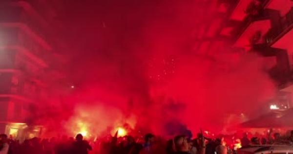 L'esultanza all'esterno dello stadio Maradona con torce e fuochi d'artificio