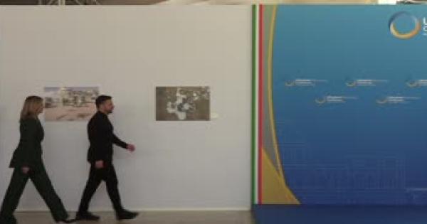 Stretta di mano con la moglie Olena Zelenska alla Conferenza per l'Ucraina
