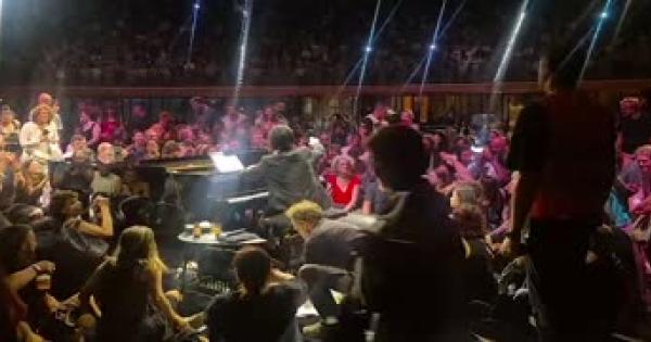 Per la prima volta, tutti seduti intorno all'artista seduto al pianoforte