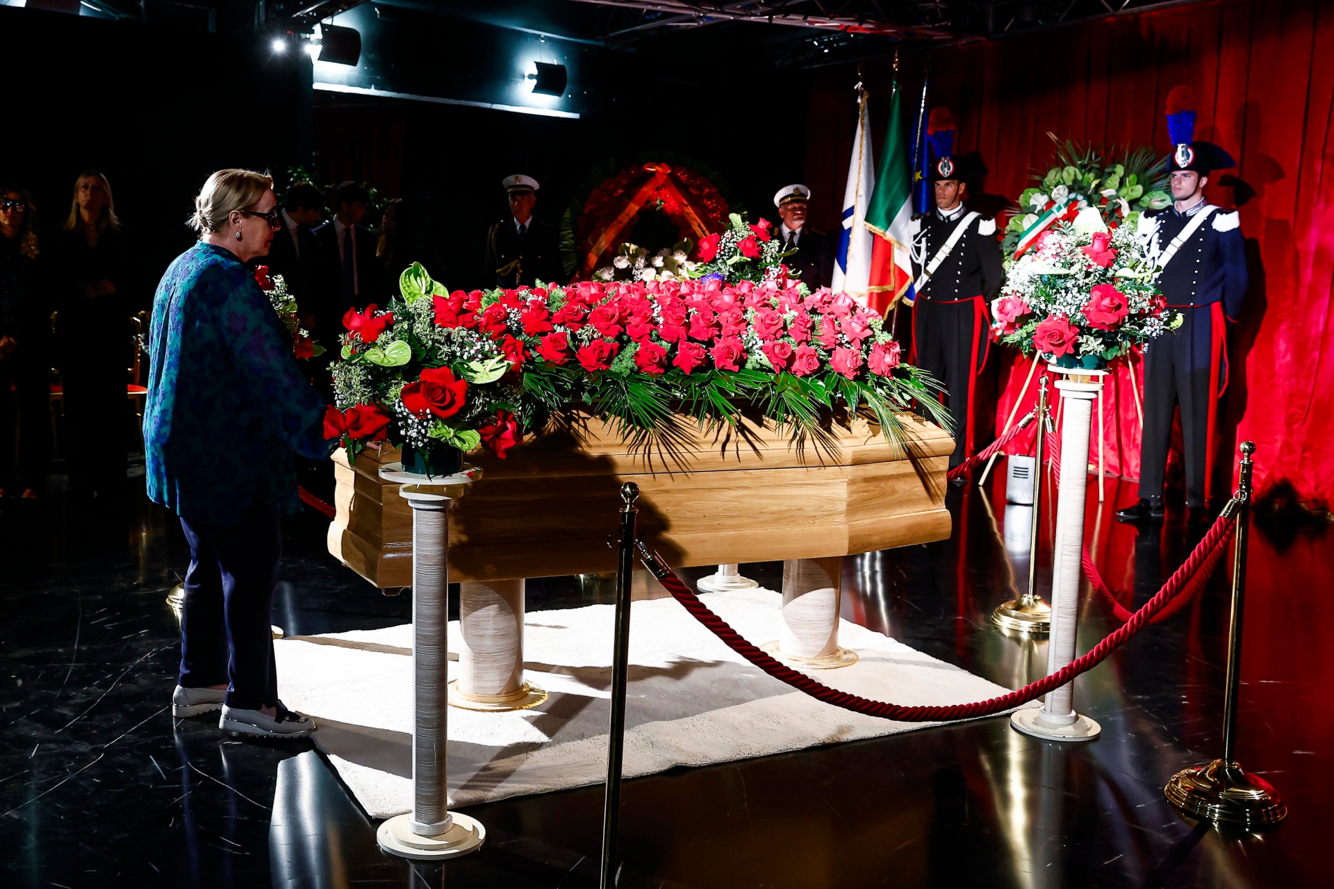 All’entrata hanno abbracciato il direttore generale della Rai Roberto Sergio. Nello studio dove il conduttore ha realizzato i suoi più importanti programmi, il feretro sul fondo di un sipario rosso è circondato da rose rosse; su uno schermo televisivo scorrono immagini della carriera del presentatore, proiettate anche all’entrata. Fra le corone intanto intorno alla bara, con un picchetto di carabinieri in alta uniforme, spiccano quelle del Presidente della Repubblica, del presidente della Camera, del sindaco di Roma e della Rai. Venier e Ricciarelli si sono sedute nello spazio riservato alla famiglia, dove hanno abbracciato la figlia e l’assistente di Baudo..