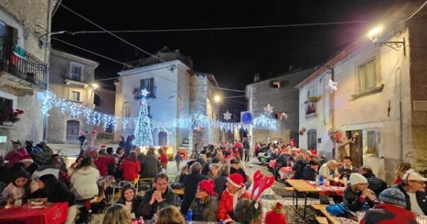 (ANSA) - ROCCA DI MEZZO, 24 AGO - Una tavolata da duecento persone, un albero addobbato con tanto di luci intermittenti e un clima più da dicembre che da Ferragosto. È il Natale d'estate andato in scena a Terranera, piccola frazione di Rocca di Mezzo, in provincia dell'Aquila, situata a 1.270 metri di altitudine nel cuore del Parco naturale regionale Sirente-Velino. Proprio per le temperature rigide, dal 'sapore' invernale, la Pro Loco ha deciso di organizzare una cena natalizia fuori stagione in piazza, con camino acceso e cappellini d'ordinanza biancorossi. Un'idea nata quasi per gioco, accompagnata da panettone, vin brulè e addobbi in piena regola. Il meteo ci ha messo del suo: pioggia, nebbia e temperature serali vicine allo zero hanno fatto il resto, trasformando l'estate abruzzese in una perfetta serata d'inverno. Dalle parti dell'Altopiano delle Rocche, non è poi così raro. Così, tra tovaglie rosse e palline colorate, il paese ha accolto residenti e turisti, moltiplicando per quattro la propria popolazione. Canti di Natale, brindisi e fotografie sotto l'albero "innevato" di condensa hanno contribuito a rendere l'atmosfera ancora più surreale. L'iniziativa, che si ripete ciclicamente per salutare la fine dell'estate, cambia tema ogni anno: nel 2023 sono stati omaggiati i personaggi Disney, mentre nella scorsa edizione protagonista è stata la cultura pop del Duemila. (ANSA).