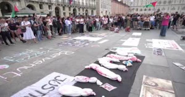 Molti i partecipanti con bandire palestinesi in piazza Castello