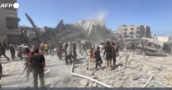 Adulti e bambini fra le macerie dell'edificio collassato dopo l'attacco mirato