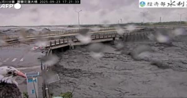 Le immagini di un ponte danneggiato dalle acque in piena nella contea orientale di Hualien