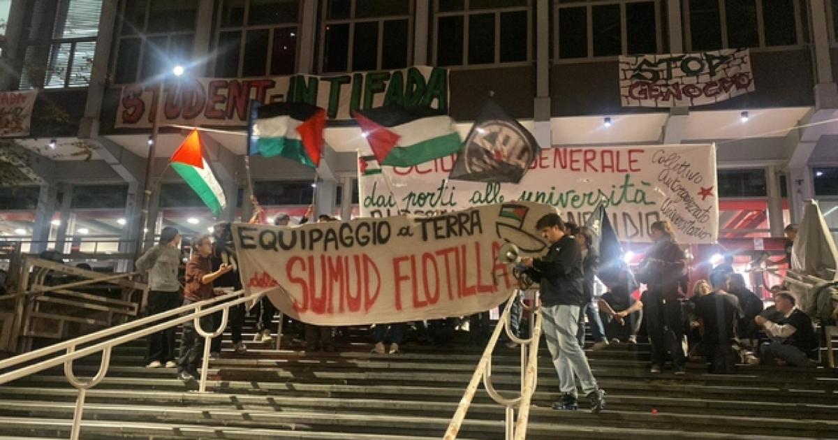 (ANSA) - TORINO, 01 OTT - Palazzo Nuovo sede delle facoltà umanistiche a Torino, è stato occupato dai collettivi universitari, dopo che nella giornata era già stato annunciato un presidio permanente pro Gaza e una protesta in 250 sulla scalinata della palazzina. I manifestanti contro il blocco della Flotilla del coordinamento Torino per Gaza davanti al Comune, diventati un migliaio, hanno iniziato intanto a muoversi in corteo, con in apertura lo striscione di Usb: "Blocchiamo tutto". (ANSA).