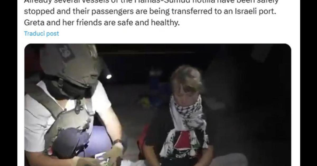 (ANSA) - TEL AVIV, 02 OTT - "Greta e i suoi amici sono sani e salvi. Diverse imbarcazioni della flottiglia Hamas-Sumud sono già state fermate in sicurezza e i loro passeggeri sono stati trasferiti in un porto israeliano". Lo scrive su X il ministero degli Esteri israeliano postando il video del fermo dell'attivista svedese Greta Thunberg. (ANSA).