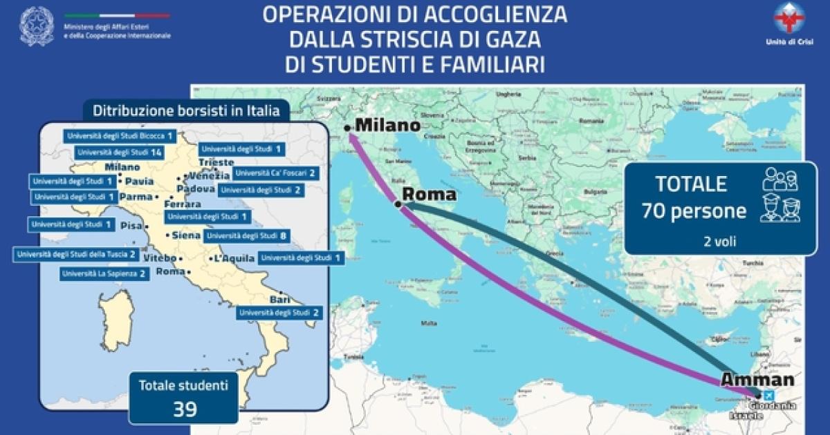 (ANSA) - ROMA, 01 OTT - Sono decollati da Amman i due voli con a bordo 70 cittadini palestinesi che giungeranno oggi nel nostro Paese. Si tratta di 39 fra studenti e ricercatori palestinesi provenienti dalla Striscia di Gaza e un gruppo di palestinesi per ricongiungimento familiare con parenti già in Italia. Prendono così avvio i "corridoi universitari" per permettere ai giovani palestinesi assegnatari di borse di studio di atenei italiani di lasciare il loro Paese per arrivare in Italia. In totale, sono oltre 150 le borse di studio assegnate finora a studenti palestinesi di Gaza. Lo rende noto la Farnesina. (ANSA).