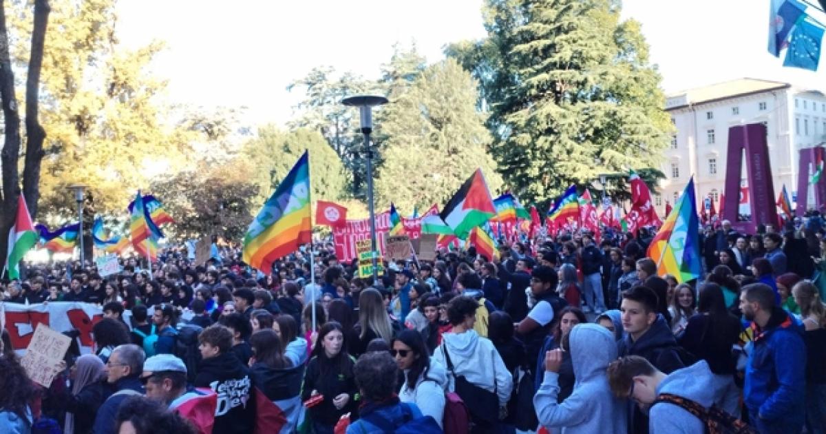 (ANSA) - TRENTO, 03 OTT - Migliaia di persone sono scese in piazza a Trento per lo sciopero generale indetto da Cgil, Usb, Cub e Sgb per Gaza e in solidarietà con la Global Sumud Flotilla. La partenza del corteo da piazza Dante è stata ritardata per una discussione in merito a chi lo aprirà, con i sindacati da una parte e gli studenti - che sono scesi in piazza anche ieri - e il Centro Sociale Bruno dall'altra. "Non abbiamo bisogno di bandiere di rappresentanza altrui, quello che ci rappresenta oggi sono le bandiere palestinesi", hanno detto gli studenti ai microfoni. (ANSA).