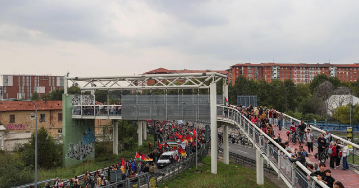 (ANSA) - MILANO, 03 OTT - Sono arrivati rinforzi di Polizia e carabinieri sulla tangenziale est di Milano bloccata dai manifestanti al termine del corteo per Gaza nel giorno dello sciopero generale. Al lancio di pietre contro militari e agenti, questi hanno risposto con i lacrimogeni e in un secondo momento anche con l'uso di idranti per allontanare i gruppi di giovani che, in buona parte a volto coperto, sono indietreggiati lungo la corsia nord. (ANSA).