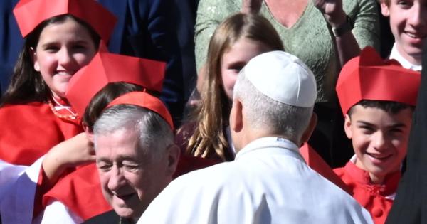 Il Papa saluta bambini e bambine vestiti da cardinali