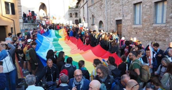 Bandiere Palestina e striscione "fraternità" per la PerugiAssisi