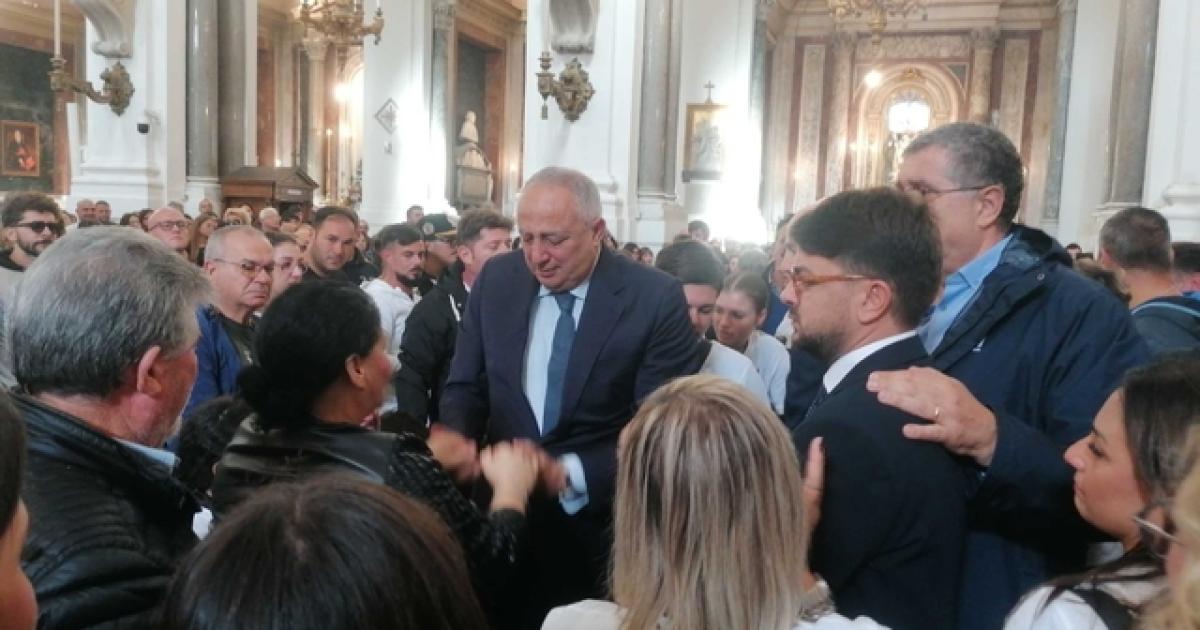 (ANSA) - PALERMO, 16 OTT - Nella cattedrale di Palermo è stata accolta da un fortissimo applauso la bara di Paolo Taormina, il ventunenne ucciso domenica scorsa con un colpo di pistola. La madre, Fabiola Galioto, il padre Giuseppe e la sorella Sofia siedono in prima fila. Al funerale anche il sindaco di Palermo, Roberto Lagalla, che visibilmente commosso ha abbracciato la madre di Paolo. (ANSA).