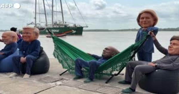 A Bele'm, indossando maschere oversize che rappresentano i leader della Conferenza Onu sul clima