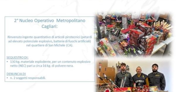 (ANSA) - CAGLIARI, 31 DIC - Petardi ad elevato potenziale esplosivo, batterie di fuochi artificiali, oltre a ulteriori ordigni, tra cui manufatti artigianali e dispositivi privi della marcatura CE, tutti destinati alla vendita. Li hanno trovati i finanzieri del 2/o Nucleo Operativo Metropolitano di Cagliari, all'interno di una piazza del quartiere San Michele dove due venditori abusivi avevano piazzato due distinte bancarelle nella stessa area, Le successive perquisizioni domiciliari hanno consentito di rinvenire altro materiale che è stato sequestrato: complessivamente 130 kg di fuochi, per un contenuto esplosivo netto pari a circa 16 kg di polvere nera. I due venditori ambulanti sono stati denunciati per commercio abusivo di materie esplodenti, per non aver adottato idonee misure di sicurezza nello stoccaggio del materiale detenuto. Inoltre sono state contestate loro violazioni amministrative per l'esercizio abusivo di attività commerciale. "L'operazione si inserisce nel più ampio dispositivo di prevenzione e contrasto predisposto dalla Guardia di finanza a tutela della salute e della sicurezza collettiva, volto a reprimere la commercializzazione di prodotti pericolosi, anche quando potenzialmente leciti, ma detenuti e posti in vendita in violazione delle specifiche disposizioni di legge", spiegano dalla Gdf di Cagliari che, in questo fine anno, ha intensificato i controlli sulla vendita illegale di fuochi d'artificio. (ANSA).
