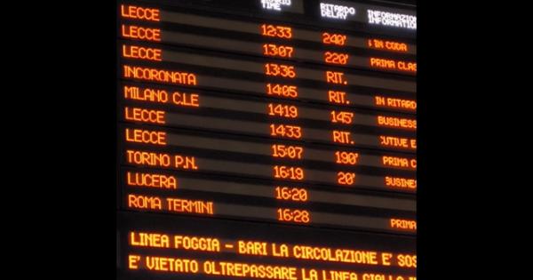 (ANSA) - FOGGIA, 02 GEN - Grandi disagi nella stazione ferroviaria di Foggia per la circolazione rallentata lungo la linea Bari-Foggia a causa di un inconveniente tecnico alla linea elettrica che ha provocato prima la sospensione della circolazione ferroviaria, poi dalle 17,30 Rfi ha reso noto che la circolazione è fortemente rallentata e ancora in serata si registrano ritardi fino a 330 minuti. I disagi sono cominciati alle 12 dopo la caduta di cavi elettrici lungo i binari sulla tratta tra Orta Nova ed Incoronata. "Un 2 gennaio fantozziano" hanno detto alcuni utenti presenti nella stazione ferroviaria del capoluogo dauno. "I ritardi accumulati da alcuni treni - il commento in un passeggero in attesa - sono arrivati anche a 240 minuti. Davvero una situazione difficile". Complessivamente, stando agli ultimi aggiornamenti sulla circolazione ferroviaria, sono otto i treni Regionali cancellati completamente o solo in alcune tratte, mentre altri 13 convogli direttamente coinvolti nei disagi hanno registrato rallentamenti in alcuni casi fino a 330 minuti, come per il Lecce-Milano partito alle 8.43 dal capoluogo salentino e il cui arrivo nel capoluogo lombardo è previsto dopo le 3 anziché alle 21.40. (ANSA).
