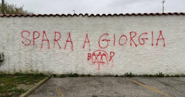 (ANSA) - PORTO RECANATI, 05 GEN - "Spara a Giorgia", accanto la sigla Br, intervallata da una stella a cinque punte. La scritta, vergata con vernice spray di colore rosso, è apparsa oggi sul muro di un parcheggio di un locale vicino al mare a Porto Recanati zona Scossicci (Macerata). Sull'episodio sta svolgendo accertamenti la Digos della Questura di Macerata per risalire all'autore. (ANSA).