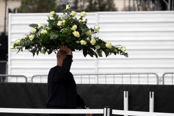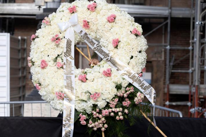 Solo fiori bianchi all’interno della chiesa. Vicino al feretro c'è una foto in bianco e nero dello stilista sorridente. I posti a sedere sono tutti pieni.