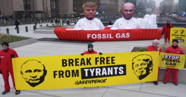 Sagome giganti con le sembianze di Putin e Trump davanti alla sede del Consiglio Ue