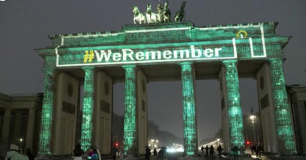 La scritta "WeRemember" sulla Porta di Brandeburgo, targhe commemorative a Monaco