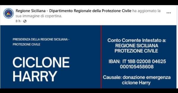 (ANSA) - CATANIA, 30 GEN - In Sicilia è stato attivano un conto corrente per donazioni a persone e attività colpite dal ciclone Harry. E' intestato a 'Regione Siciliana Protezione civile' con la causale: donazione emergenza ciclone Harry. L'Iban, pubblicato sulla pagina Facebook della Protezione civile regionale, è IT0200804625000105458608. (ANSA).