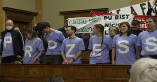 Un gruppo di attivisti compone la scritta "processo farsa" sulle magliette, "free Maja!"
