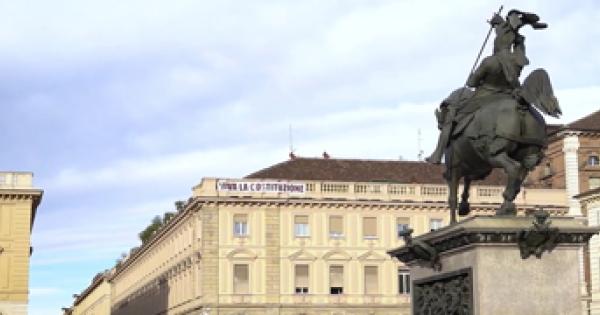 Appeso sul terrazzo di un attico in uno dei luoghi simbolo della citta'