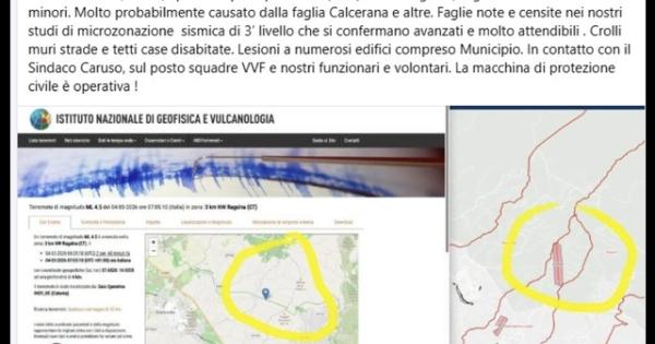 (ANSA) - CATANIA, 04 MAR - Il sisma di magnitudo 4.5 registrato alle 7.05 sull'Etna, vicino a Ragalna, seguito da altre scosse di minore intensità, "molto probabilmente è stato causato dalla faglia Calcerana e altre faglie note e censite nei nostri studi di microzonazione sismica di terzo livello che si confermano avanzati e molto attendibili" ha causato "crolli di muri di strade e tetti case disabitate" e "lesioni a numerosi edifici, compreso il Municipio". Lo scrive su Facebook Salvo Cocina, capo dipartimento della Protezione civile regionale, che è in contatto col il sindaco Caruso. Sul posto, segnala Cocina, sono presenti squadre dei vigili del fuoco e nostri funzionari e volontari. "La macchina di protezione civile - conclude - è operativa". (ANSA).