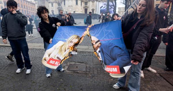 (ANSA) - ROMA, 14 MAR - Bruciati con i fumogeni due cartelloni con la presidente del consiglio Giorgia Meloni, in uno insieme al ministro Nordio, nel corso del corteo a Roma, a piazza dell'Esquilino. La prima immagine raffigurava la premier mentre teneva a guinzaglio e con la museruola il ministro della Giustizia. Sopra la scritta: "No al vostro referendum". Mentre la seconda fotografia rappresentava la stretta di mano tra Meloni e Netanyahu con su scritto: "No al vostro genocidio, 75mila civili uccisi, 2 milioni di sfollati". (ANSA).