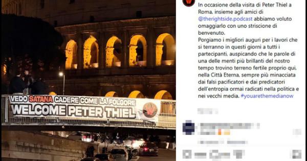 (ANSA) - ROMA, 15 MAR - "Vedo satana cadere come la folgore. Welcome Peter Thiel". E' la scritta presente su uno striscione esposto questa notte a poca distanza dal Colosseo e poi rimosso dagli agenti della Polizia di Stato. L'iniziativa è del sito Welcome to Favelas che ha pubblicato una foto sul suo profilo instagram. "In occasione della visita di Peter Thiel a Roma, insieme agli amici di @therightside.podcast abbiamo voluto omaggiarlo con uno striscione di benvenuto", si legge in un post pubblicato a corredo della foto. (ANSA).