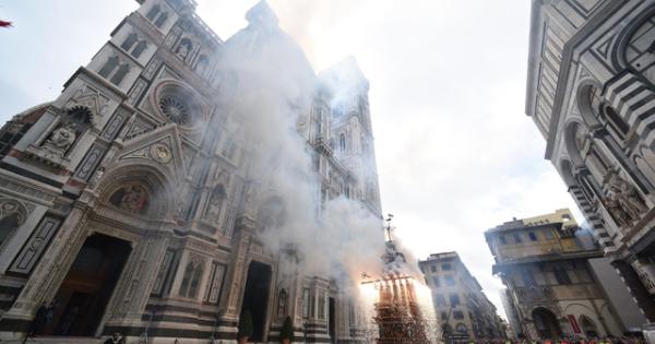 (ANSA) - FIRENZE, 05 APR - Vola bene la 'colombina' in piazza Duomo a Firenze per lo Scoppio del carro, tradizione popolare per Pasqua che si tramanda da oltre nove secoli: la rievocazione ripercorre le gesta dei fiorentini alle Crociate e del loro ritorno in città nel 1101. La 'colombina' è il congegno trasportato da un razzo innescato dal cero santo - 'accensione' a opera dell'arcivescovo di Firenze, monsignor Gherardo Gambelli, all'interno della Cattedrale -, che 'incendia' il carro posizionato tra Duomo e Battistero, o meglio i petardi e i fuochi pirotecnici di cui è corredato. In una giornata di sole e con una piazza come sempre gremita di migliaia di persone tra fiorentini e turisti, la 'colombina', partita dall'altare della Cattedrale, ha raggiunto all'esterno il carro di fuoco, detto Brindellone, e poi è tornata indietro, lungo la navata centrale, senza problemi. La tradizione tramanda che se riesce a volare e a rientrare senza intoppi è segno di speranza e di buoni raccolti. Come da tradizione anche la benedizione alla folla e al Brindellone, prima che fosse acceso, da parte di monsignor Gambelli. Dopo lo Scoppio del carro la rrosecuzione della messa in Duomo, celebrata dall'arcivescovo. Tra i presenti la sindaca di Firenze Sara Funaro e anche il presidente della Toscana Eugenio Giani. La storia affida a Pazzino de' Pazzi, al ritorno da una crociata nel 1099, le origini dello Scoppio del carro. Fu Pazzino, a riportare alcune pietre focaie del sepolcro di Cristo con le quali poi a Firenze venivano illuminate le celebrazioni del Sabato santo. In un secondo tempo la cerimonia venne spostata alla domenica e i fiorentini decisero di costruire un carro trionfale, detto Brindellone, che ancora oggi è scortato fino in piazza Duomo dagli armigeri del Comune nei tipici costumi. La forma attuale del carro risale al '600. Per tutto l'anno il Brindellone resta in un apposito deposito di via il Prato e il giorno di Pasqua arriva al Duomo trascinato da quattro buoi, agghindati per la festa. (ANSA).