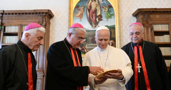 (ANSA) - ROMA, 10 APR - "Siete segni di speranza in un mondo segnato da violenze assurde e disumane, che mosse dall'avidità e dall'odio, dilagano con ferocia proprio nelle terre che hanno visto sorgere la salvezza", "profanate dalla blasfemia della guerra e dalla brutalità degli affari, senza riguardo per la vita della gente, ritenuta al massimo effetto collaterale dei propri interessi. Ma nessun interesse può valere la vita dei più deboli", "aiutateci a proclamare chiaramente che Dio non benedice alcun conflitto" che "chi è cristiano non sta mai dalla parte di chi ieri impugnava la spada e oggi lancia le bombe". Così il Papa ai vescovi di Baghdad. (ANSA).