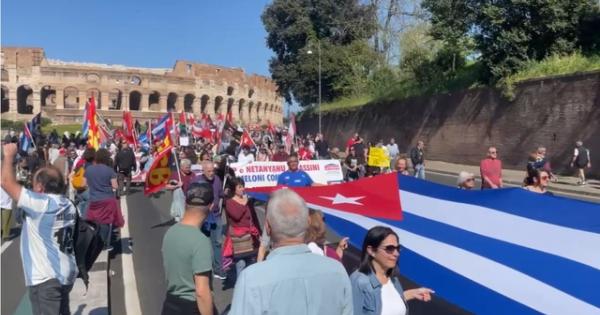 (ANSA) - ROMA, 11 APR - Diverse centinaia di persone sfilano oggi nella Capitale per la manifestazione nazionale a sostegno della popolazione cubana, colpita dalla crisi energetica e dall'embargo Usa. Il percorso del corteo - dal titolo 'Cuba non è una minaccia' - , che termina a piazzale Ostiense, attraversa via di San Gregorio e viale Aventino. Tra i manifestanti molte famiglie e anche striscioni contro il presidente Usa, Donald Trump, il primo ministro di Israele, Benjamin Netanyahu, e la premier Giorgia Meloni, oltre a bandiere dei movimenti di sinistra. (ANSA).