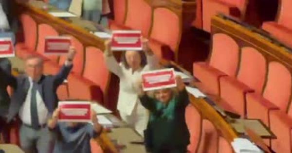 I cartelli dei parlamentari subito dopo il voto del decreto al Senato