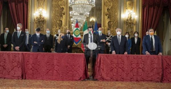 "La delegazione unitaria del centrodestra, che rappresenta la maggioranza del Paese e governa 14 regioni su 20, ha espresso al Presidente della Repubblica la comune preoccupazione per la situazione sanitaria, economica e sociale in cui versa l'Italia, situazione che è stata aggravata da un Governo incapace e nato da un accordo di Palazzo". Lo ha detto il segretario della Lega, Matteo Salvini, al termine delle consultazioni del centrodestra con il capo dello Stato, Sergio Mattarella.